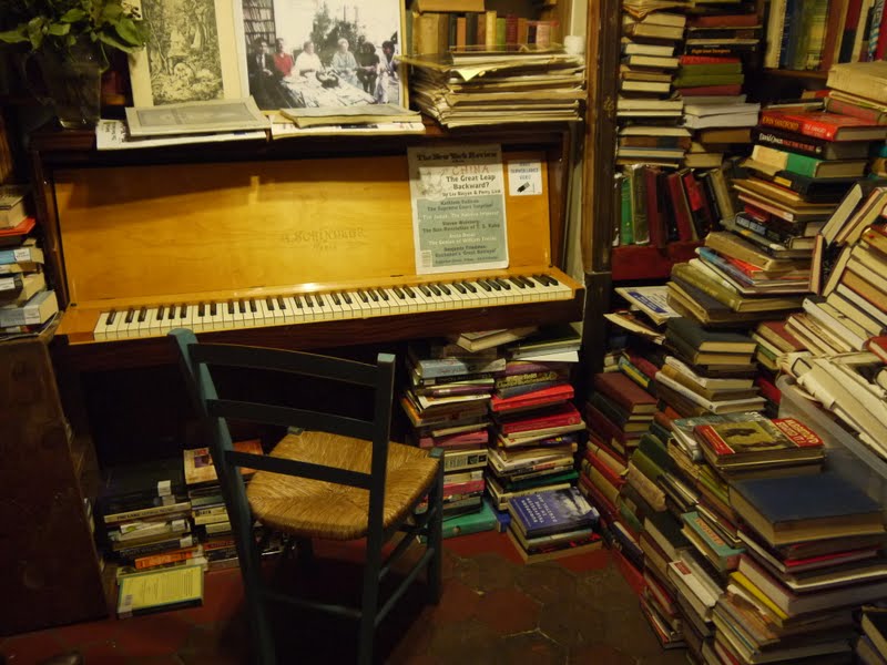chandelier. The bookshelves and stairway are made of wood and that also gives it a comforting feel. When George Whitman first bought the building, he used the third floor as his living quarters, and the bottom two floors as his business and there are still touches in the store that make it feel like a home. Just like in Christopher Morley’s The Haunted Bookshop, the building serves as a bookstore as well as living space. There is a piano by the staircase on the second floor, and of course it has books piled on top of it. Even the stove has books on top of it. Although there isn’t a large amount of seating, there is an occasional comfy chair where visitors can sit down and flip through a book. There are also beds in certain corners of the bookstore. George Whitman had always welcomed writers (often referred to as “tumbleweeds”) to stay in the store and sleep in any of the thirteen beds. He usually didn’t even require that they pay room and board. Instead, he had them help with in the store for an hour and read a book every day. Books were very important to George just like the character of Mr. Mifflin in Morley’s novel. In the novel, books were necessary on the same level of as food. Books neuter the mind. There are not as many beds now that Sylvia Beach Whitman has taken over the store, but she still welcomes traveling writers to stay and feel at home.